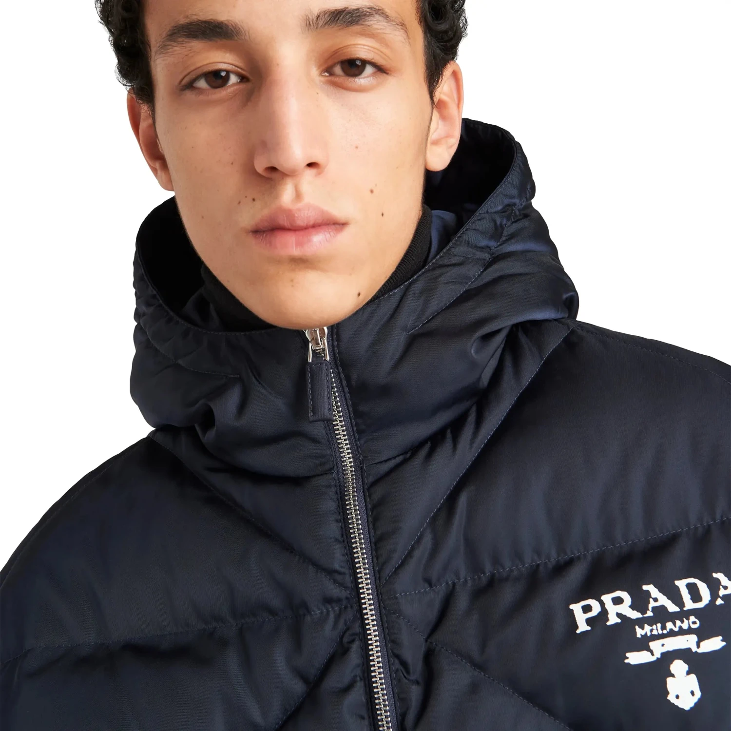 The Prada Cropped Re-Nylon Blue Down Jacket, made from environmentally friendly regenerated nylon, blends classic design with contemporary sustainability. Its modern, adaptable style is ideal for both urban and outdoor environments due to its sleek navy-blue tone, cropped cut, and quilted construction. It features a hood, elasticised cuffs, the recognisable Prada emblem on the chest for a sophisticated touch, and down insulation for warmth. This jacket, which combines luxury and environmentally aware innovation, is a striking piece that is both lightweight and cosy.